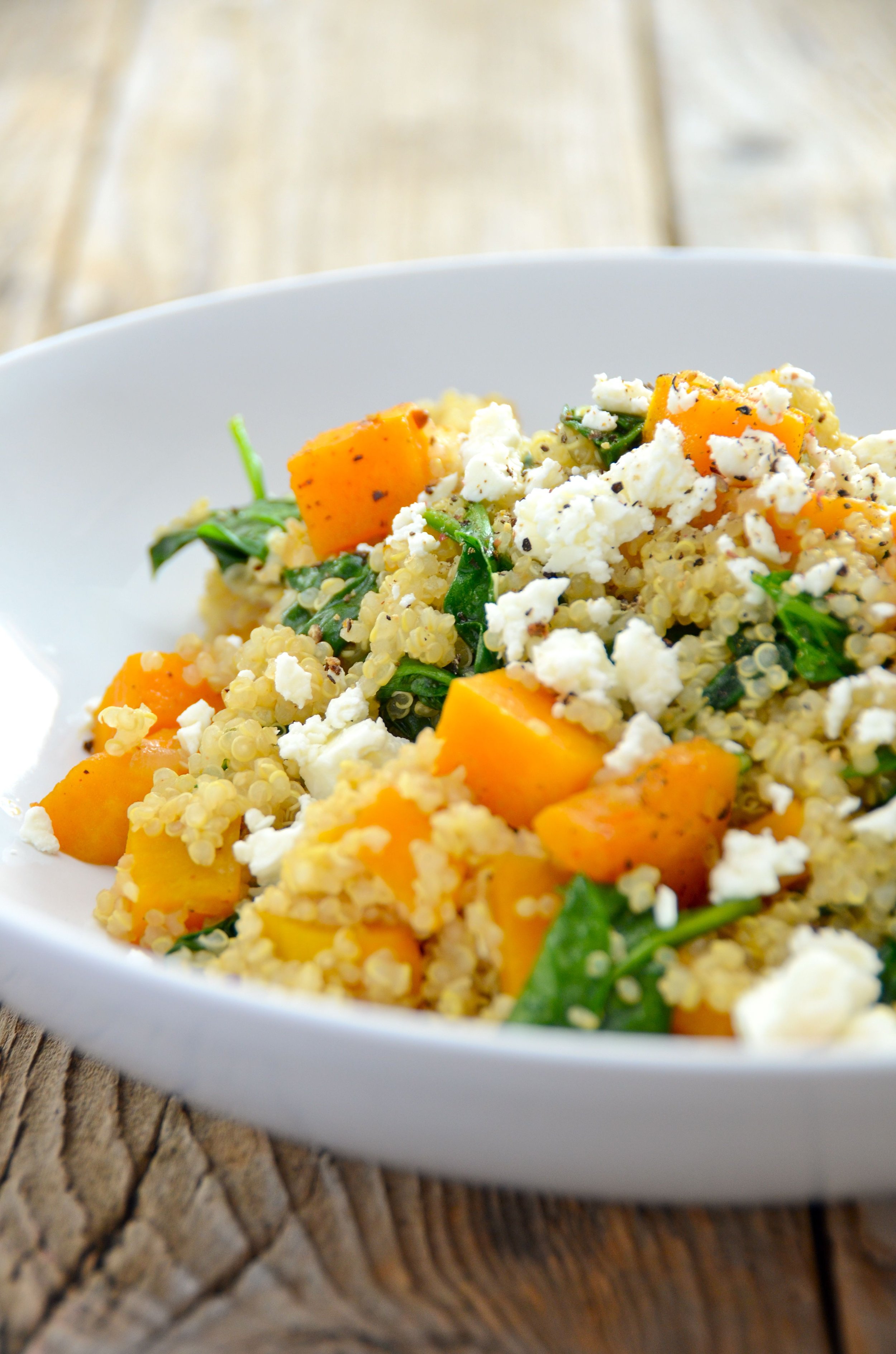 Spinat unter den Kürbis heben und Gemüse mit Quinoa mischen.