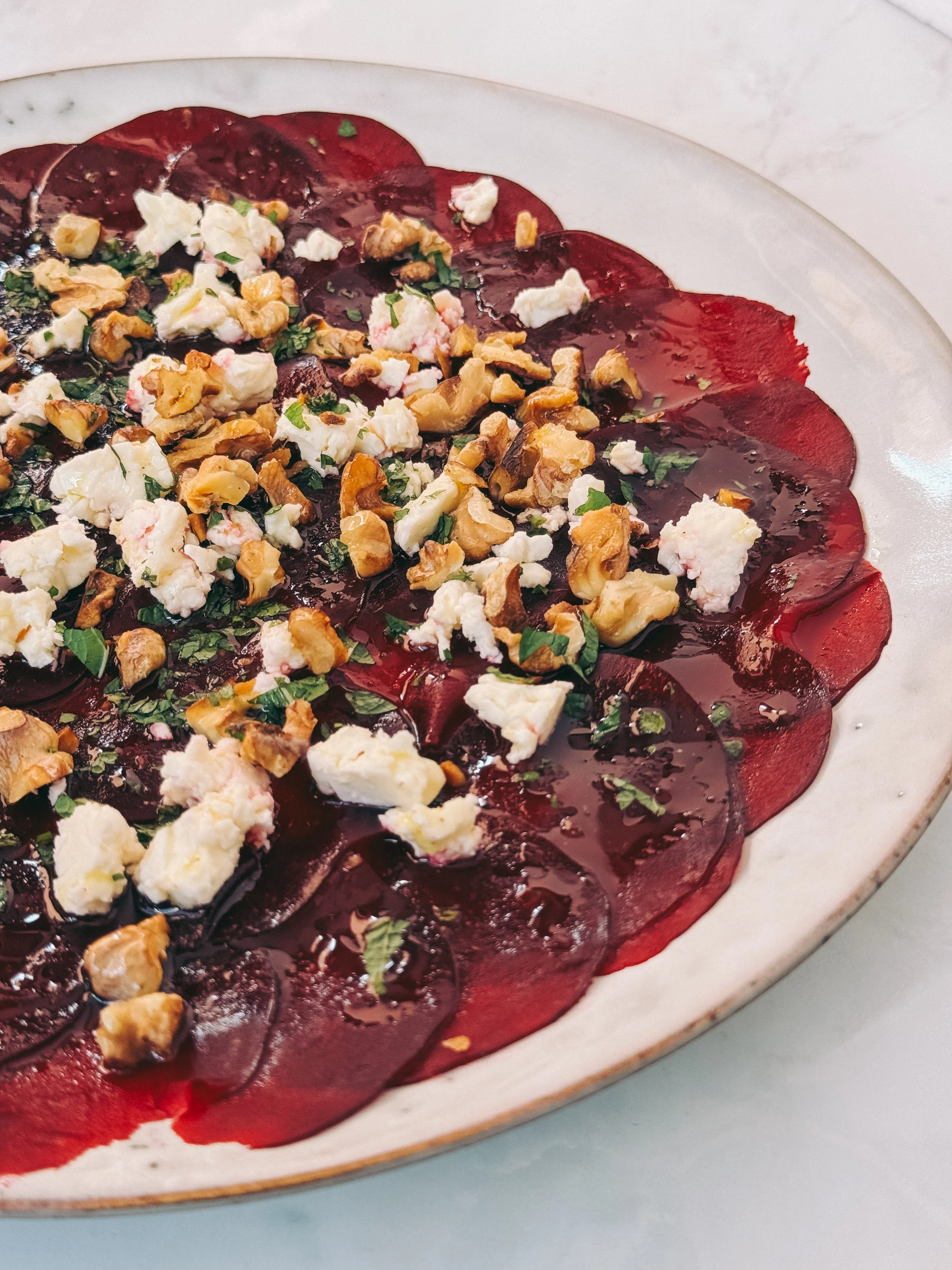 Randen-Carpaccio mit Feta, Walnüssen & Minze